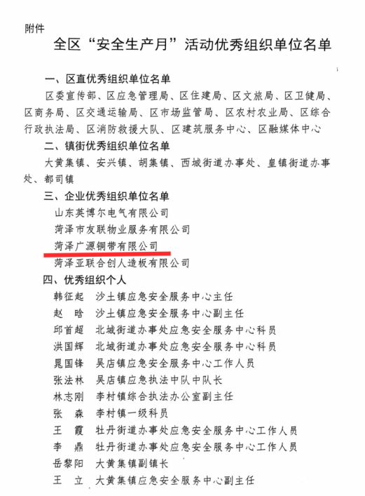 喜報:菏澤廣源銅帶有限公司榮獲牡丹區(qū)"安全生產(chǎn)月"活動優(yōu)秀組織單位稱號