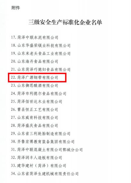 菏澤廣源銅帶有限公司獲評“三級安全生產(chǎn)標(biāo)準(zhǔn)化企業(yè)”--安全管理再上新臺階