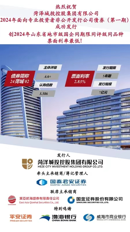 菏澤城投控股集團(tuán)2024年面向?qū)I(yè)投資者非公開發(fā)行公司債券(第一期)成功發(fā)行